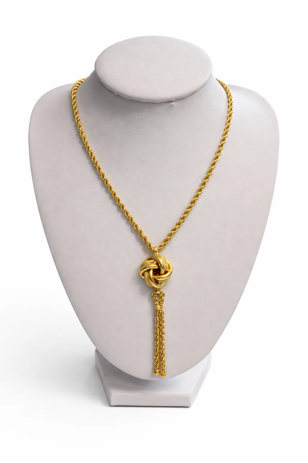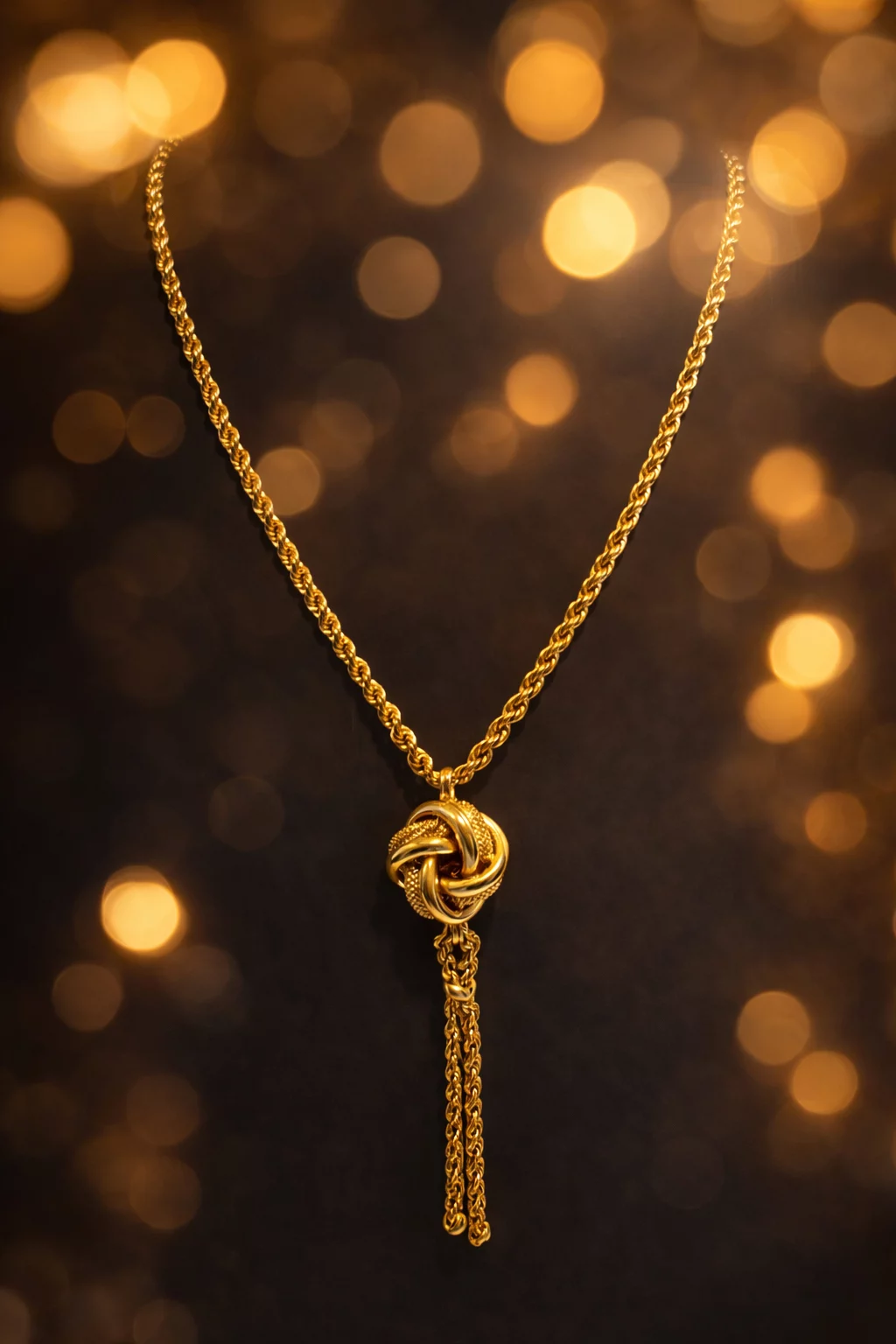Ce collier se distingue par sa chaîne torsadée en or 18 carats, mettant en valeur un pendentif en forme de nœud finement entrelacé. La touche finale est apportée par une charmante pampille composée de délicates chaînettes, qui apporte mouvement et élégance au bijou.